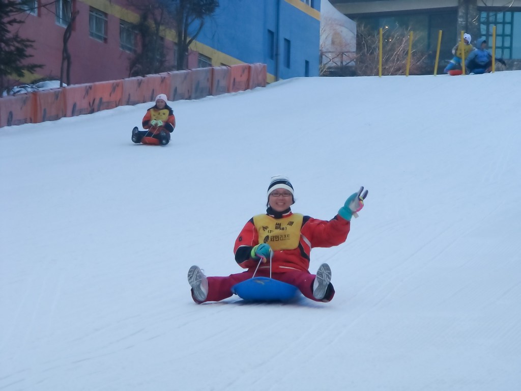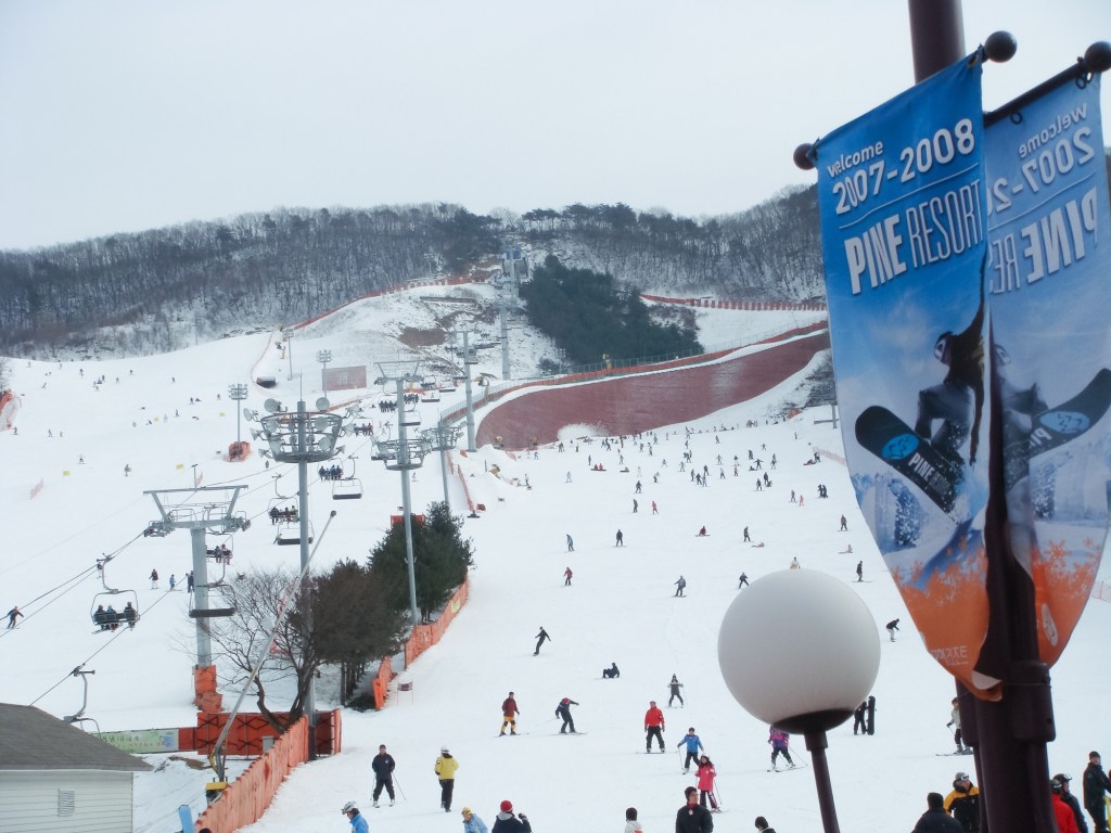 Pukul 6 pagi, alarm berbunyi. Hari ini kami menuju Yangji Pine Ski Resort (용인 양지파인리조트) di Yongin! Perjalanan dengan bus grup kami warnai dengan foto-foto pemandangan pegunungan bersalju melalui jendela.