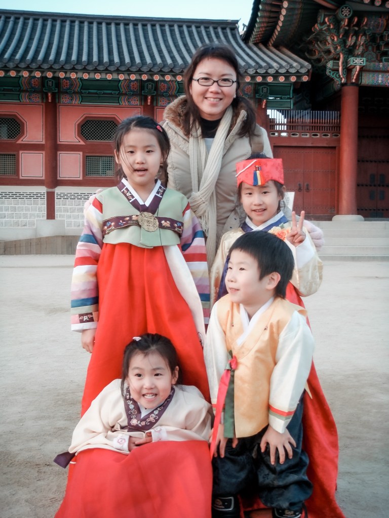 - Di tengah jalan, kami melihat anak-anak kecil mengenakan hanbok warna-warni yang sedang berjalan dengan orang tua mereka.