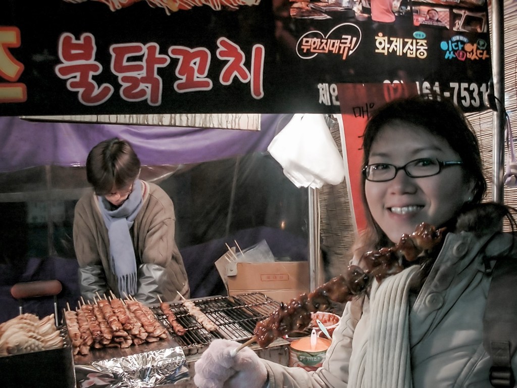 - Aroma bawang putih dari stan tteokbokki bertabrakan dengan wangi manis hotteok di gerobak sebelahnya.