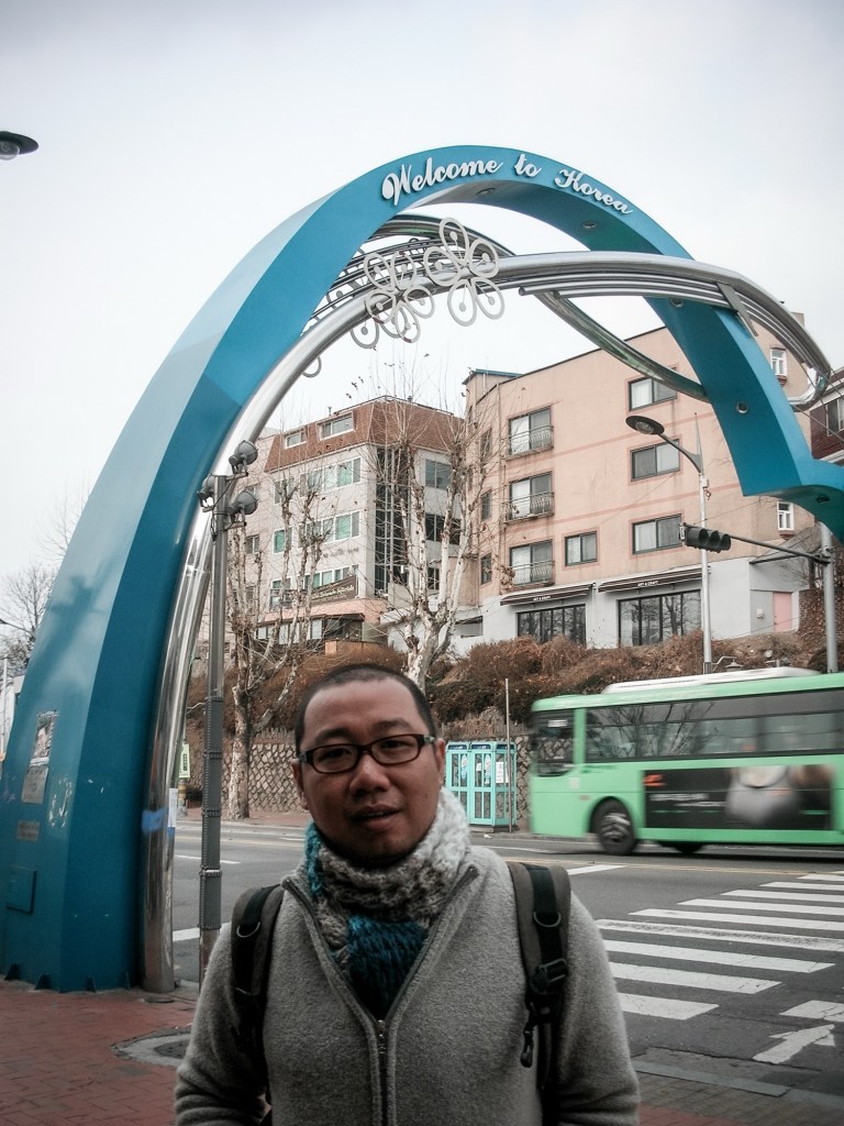 - Di tengah jalan utama, kami menemukan gerbang biru futuristik yang menjadi landmark tak resmi Itaewon.