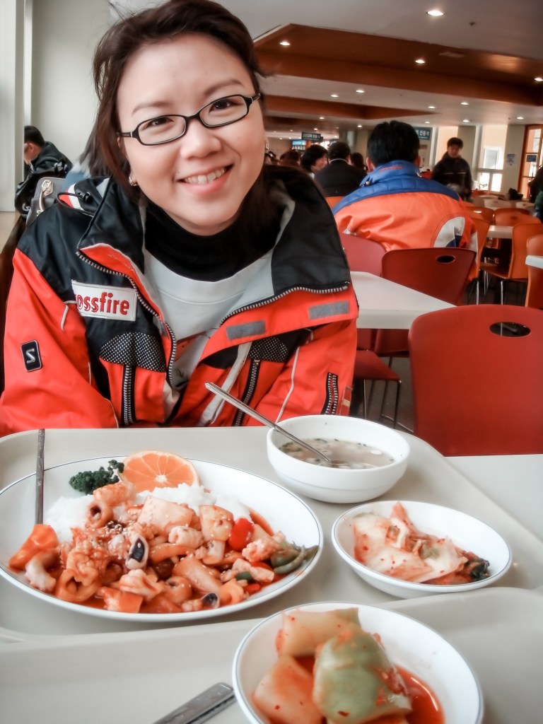 Setelah bermain salju sejak pagi, perut kami sudah keroncongan. Kami pesan makanan lokal pastinya, dan mencoba bibimbab cumi pedas di kafetaria resort.