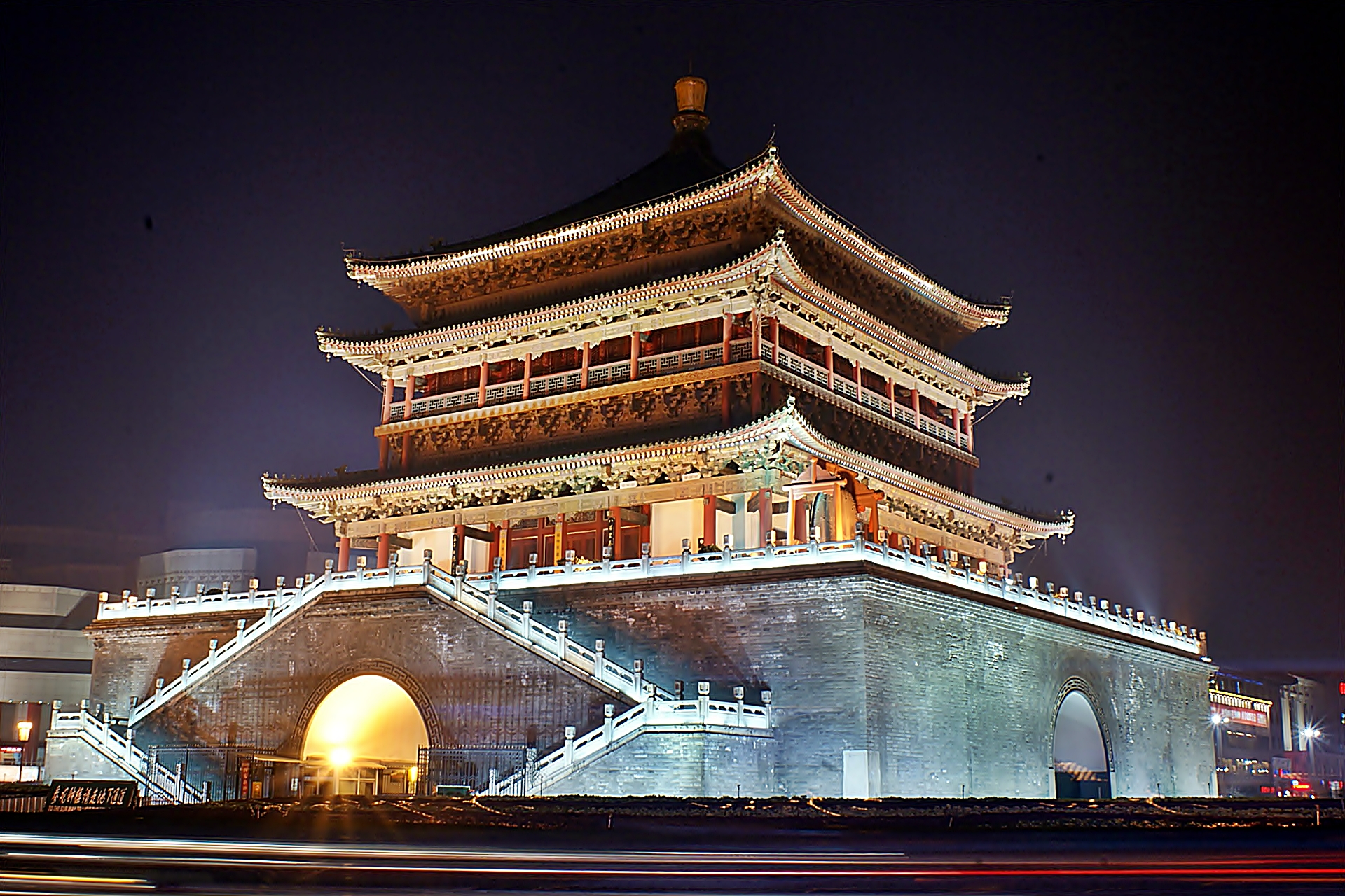 Bell Tower adalah bangunan tradisional yang megah, yang menandai pusat geografis ibu kota kuno. Dari landmark penting ini, Jalan Timur, Selatan, Barat, dan Utara membentang, menghubungkan Menara ke Gerbang Timur, Selatan, Barat, dan Utara dari tembok kota Dinasti Ming. Menara kayu ini, yang merupakan yang terbesar dan paling terawat di Tiongkok, tingginya 36 meter (118 kaki). Menara ini berdiri di atas dasar bata dengan panjang 35,5 meter (116,4 kaki) dan tinggi 8,6 meter (28,2 kaki) di setiap sisi. Selama Dinasti Ming, Xi’an adalah kota militer penting di Tiongkok Barat Laut, sebuah fakta yang tercermin dalam ukuran dan signifikansi sejarahnya.