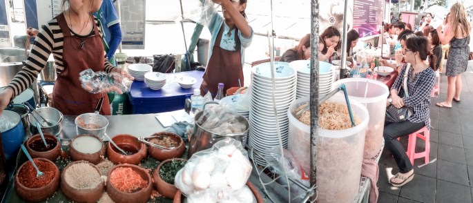 Di depan kuil, ada beberapa orang berjualan makanan, dan seorang street vendor tengah sibuk mengiris daging babi dan menyusun rice noodles ke dalam mangkuk. “Kway Jab!”, mengingat rekomendasi teman tentang hidangan berkuah pekat dengan rasa lada hitam yang khas. Kami memesan dua mangkuk dan duduk di bangku kecil di tepi jalan. Kuahnya panas, gurih, dan sedikit pedas—sempurna untuk udara Desember yang berhembus pelan.