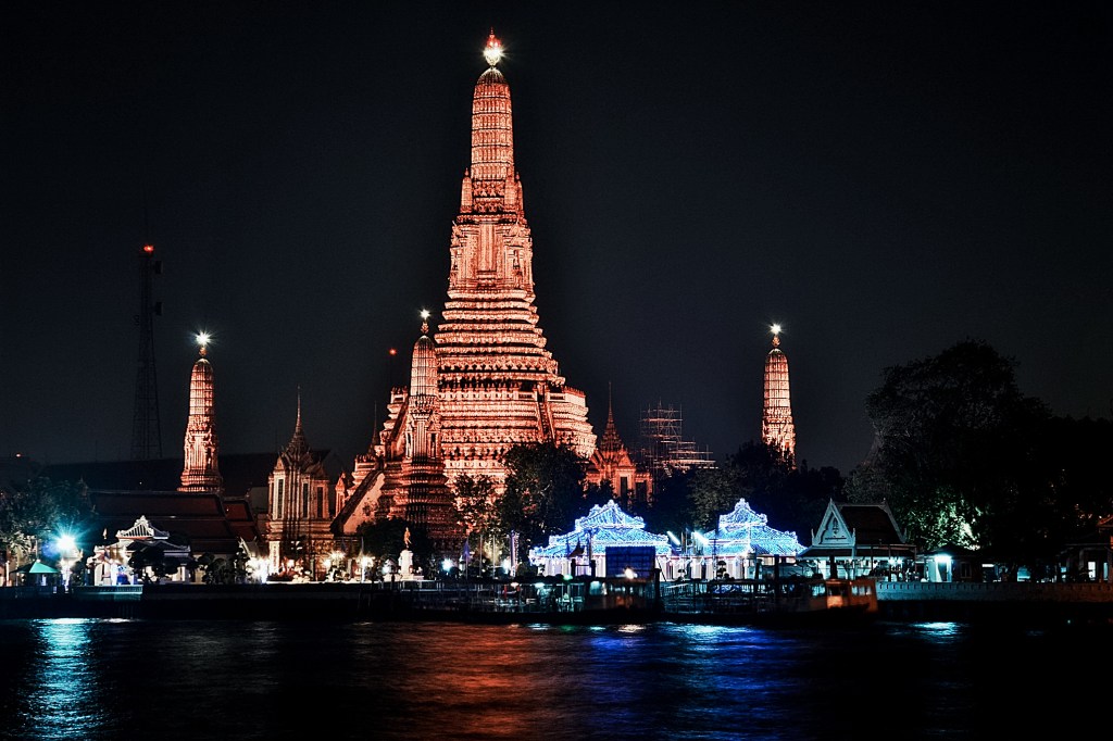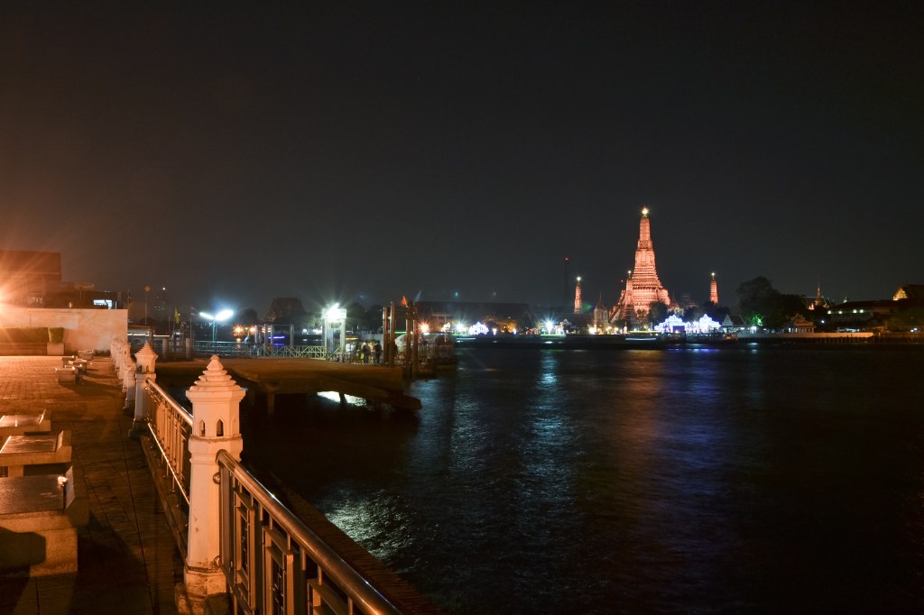 Keluar dari kesunyian Wat Pho, kami kembali disambut gemerlap lampu kota di sepanjang tepian Chao Phraya. Di seberang sungai, Wat Arun masih berdiri megah—kini tampak seperti istana kertas yang diterangi dari dalam, pantulannya bergetar di air yang menghitam.