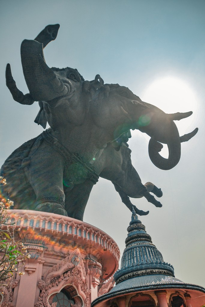 Patung Gajah Airavata: Gajah mitologis tiga kepala setinggi 29 meter (simbol langit dalam kepercayaan Hindu) berdiri megah di atas bangunan merah muda.