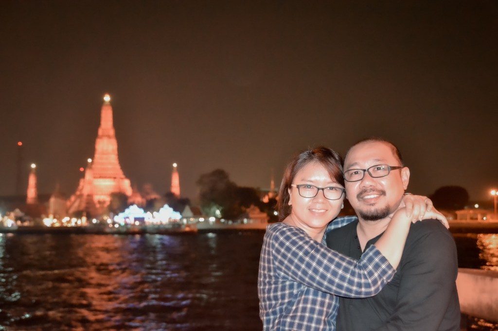 Setelah puas, kami balik ke seberang sungai, menara Wat Arun tampak seperti lukisan hidup. Lampu-lampu kuning menyorotinya, membuat mozaik keramiknya berkilauan lembut di kegelapan.