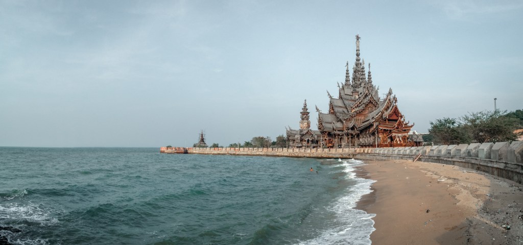 Keesokan harinya—31 Desember 2013, hari terakhir tahun itu—kami memulai pagi dengan mengunjungi Sanctuary of Truth (Prasat Sut Ja-Tum), kuil kayu megah yang menjulang di tepi pantai Pattaya.