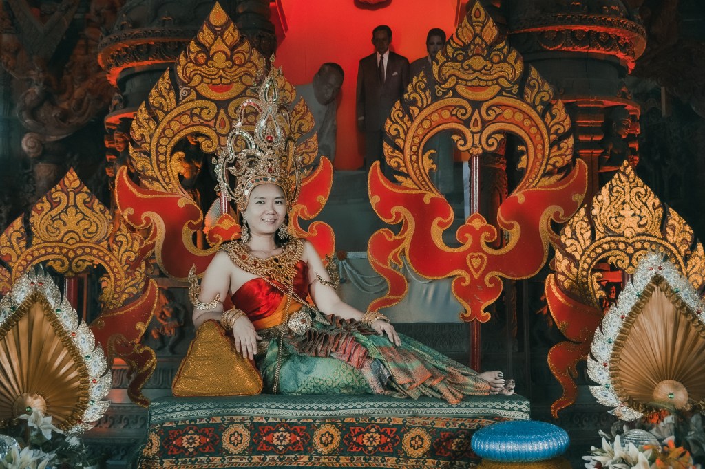 Pilihan Baju: Chut Thai (เสื้อไทย) klasik—Villen memilih gaun sutra merah marun dan bawahan hijau dengan sabuk emas dan mahkota kembang goyang untuk rambut.