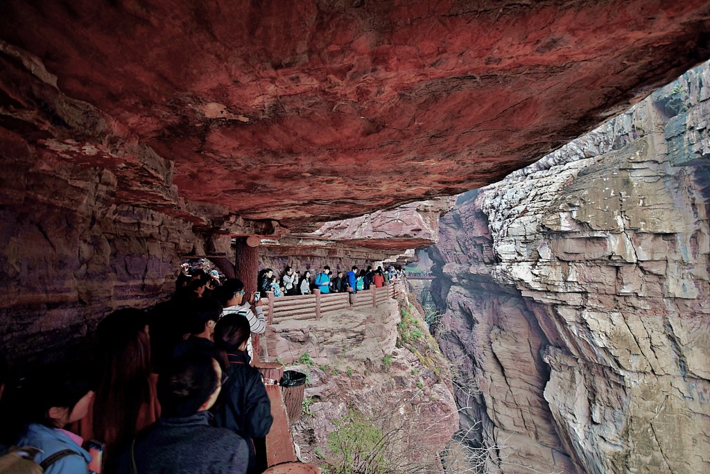 - Lembahnya dalam (68 meter) tapi dikelilingi tebing-tebing curam & formasi batuan merah (Danxia) yang seperti dipahat dengan detail.