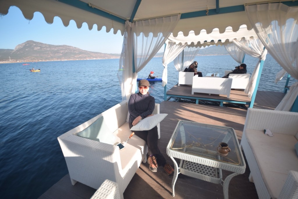 Kami diberi dua pilihan: horseback riding dulu atau makan siang. Karena lapar dan butuh toilet yang layak, kami pilih makan siang dulu. Ternyata… ternyata! Mereka membawa kami ke tempat yang jauh lebih bagus—sebuah restoran tepi danau dengan tenda-tenda putih dan sofa santai. Toiletnya bersih, pemandangannya cantik!