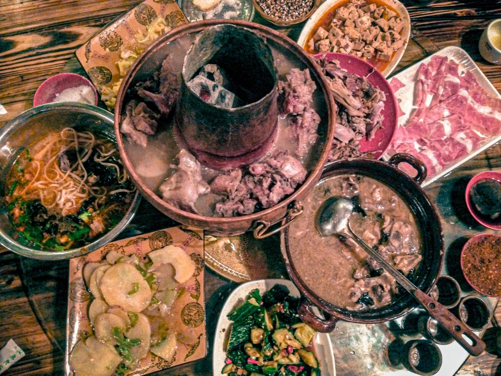 Makanannya dihidangkan dalam hot pot, lengkap dengan sayuran, daging, susu mentega, dan anggur lokal yang kuat banget!