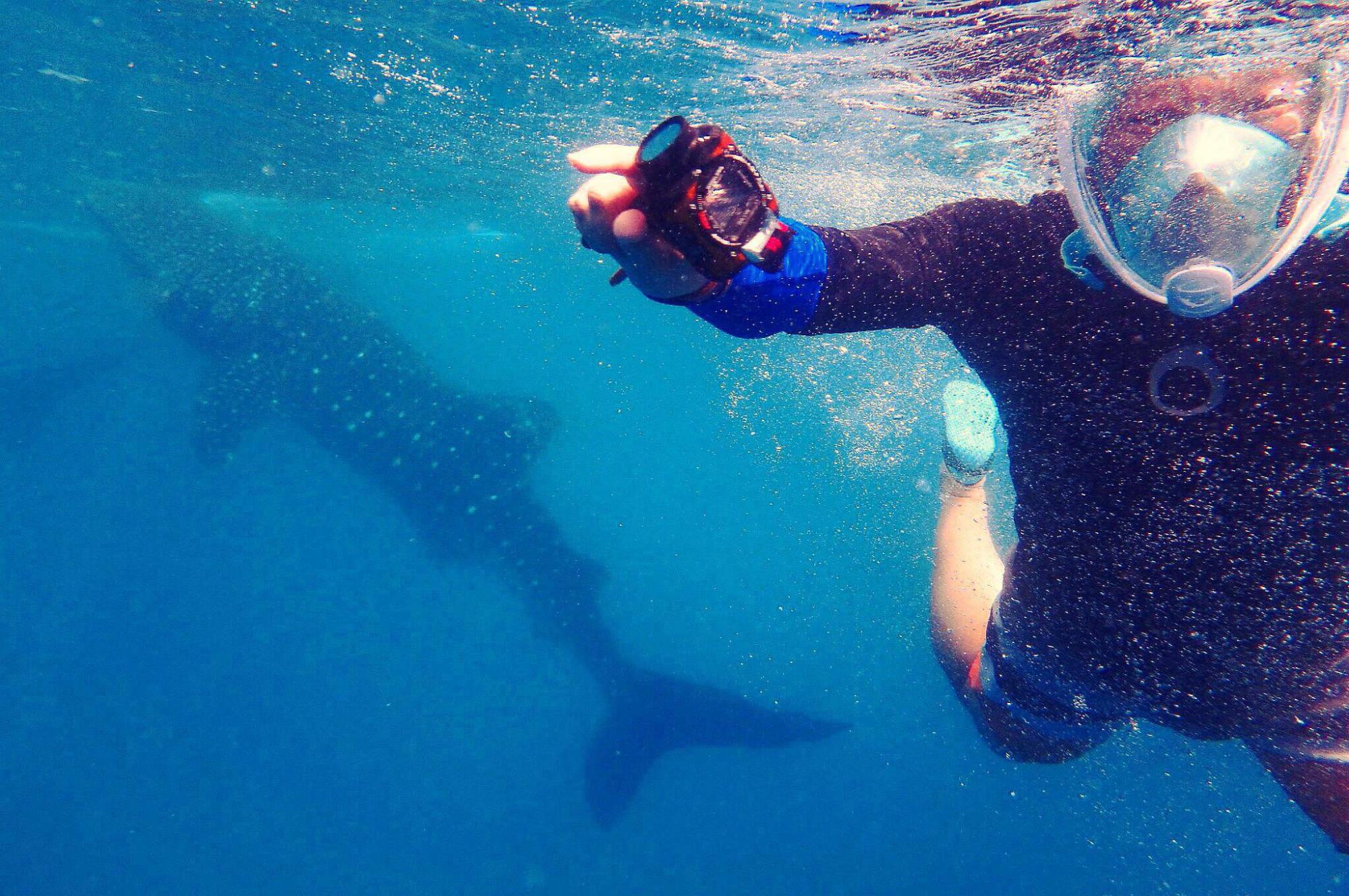 Kami naik perahu kecil ke tengah laut dan dengan hati yang berdebar, menyelam ke dalam air jernih. Melihat hiu paus dari dekat adalah pengalaman yang luar biasa, melihat makhluk besar dan anggun ini berenang di sekitar kami. Rasanya seperti mimpi yang menjadi kenyataan.