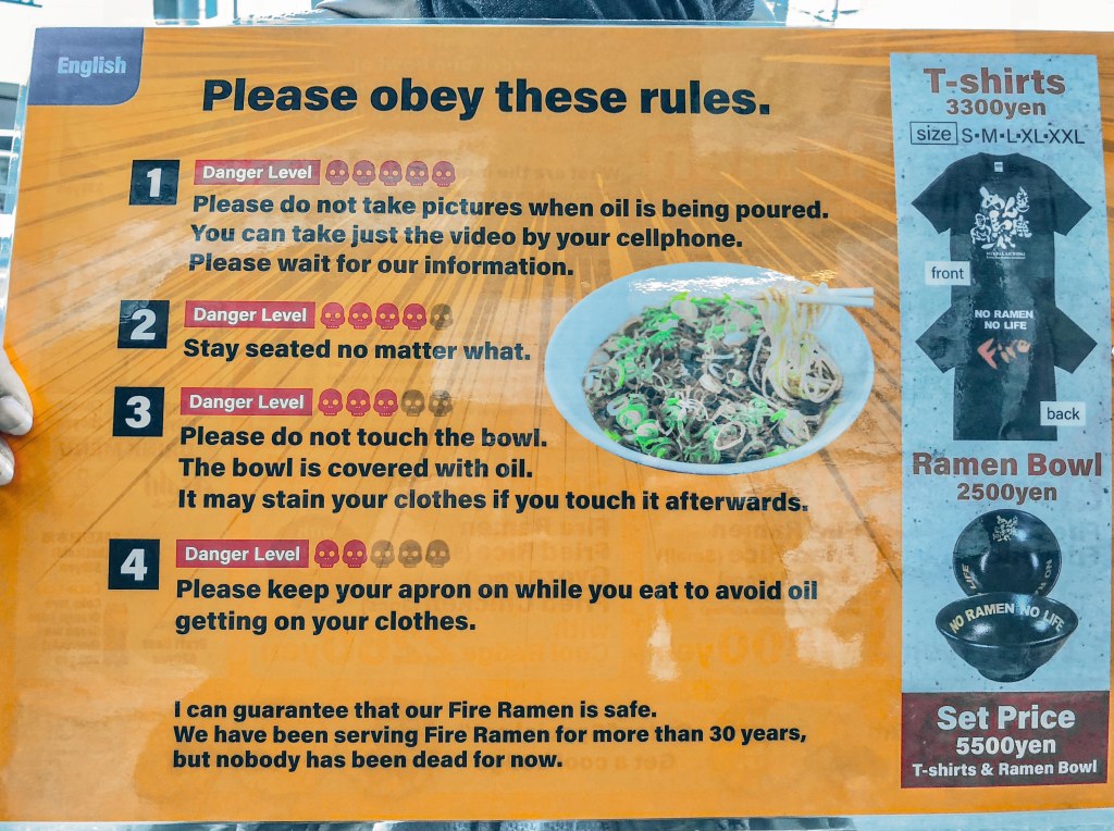 - Dilarang memotret/merekam saat chef membakar ramen—kecuali setelah dapat izin atau saat api sudah padam. Alasannya, agar konsentrasi chef tidak terganggu dan demi keamanan.