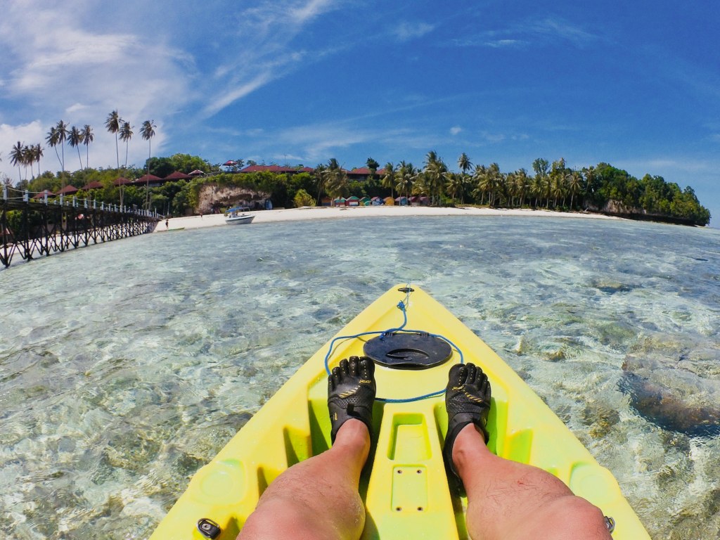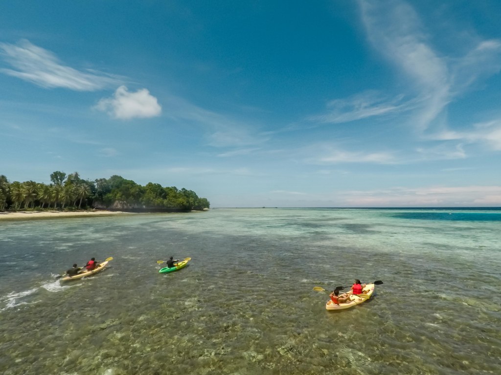 Meski beberapa dari kami belum pernah mengayuh sebelumnya justru jadi kenangan lucu! Saat mulai mendayung, air laut begitu jernih sehingga kami bisa melihat terumbu karang dan ikan-ikan kecil di bawah kayak. Pantai di area pulau Maratua ini dikelilingi oleh pasir putih dan hutan bakau di beberapa bagian. Kami mendayung perlahan menyusuri garis pantai, menikmati angin sepoi-sepoi dan suara ombak kecil.
