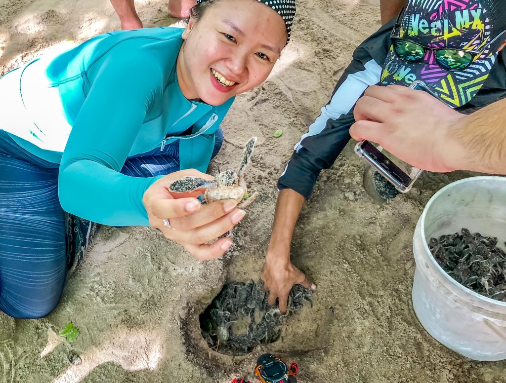 Jadi pemberhentian pertama kami adalah: Pulau Sangalaki, sebuah pulau kecil yang jadi pusat konservasi penyu hijau (Chelonia mydas) di Kepulauan Derawan. Pulau ini juga mempunyai pantai pasir putih dengan air biru kristal, dikelilingi pohon kelapa. Kami beruntung karena sedang ada batch telur yang menetas pagi itu!