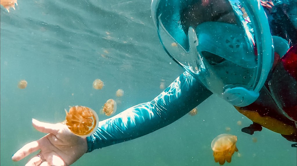 Fakta Unik: Karena tak ada predator, ubur-ubur di sini kehilangan kemampuan menyengat sama sekali! Rasanya ajaib berenang bersama ubur-ubur tak menyengat yang lembut seperti jelly.