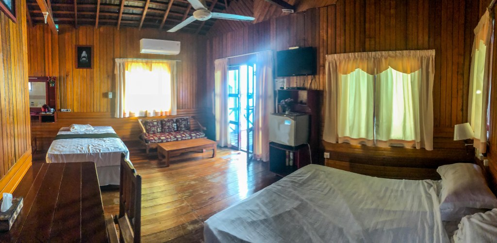 Begitu perahu kami merapat ke dermaga Maratua Paradise Resort, pandangan kami langsung tertuju pada deretan bungalow kayu berwarna coklat muda yang menjorok di atas laut biru kehijauan. Inilah kamar kami untuk 4 hari 3 malam – rumah kecil di tengah surga.