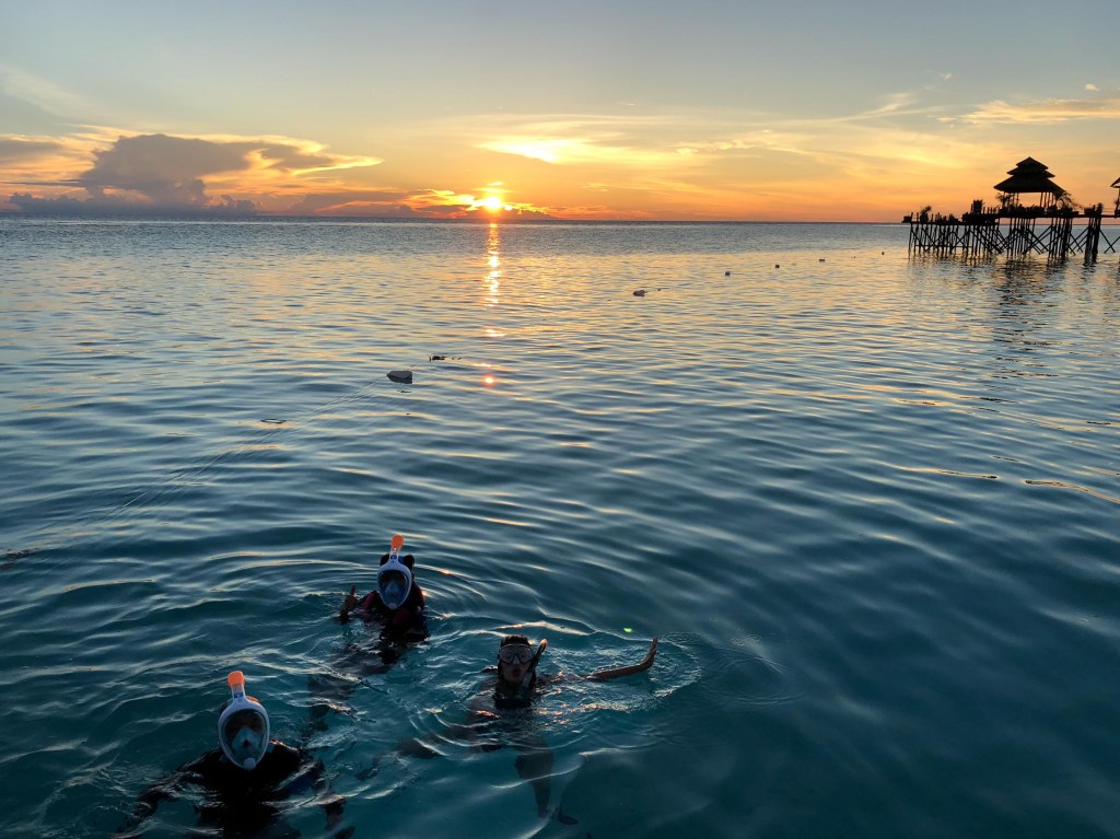 Tiba di resort: Matahari terbenam dengan warna jingga-merah muda dan kami meneruskan berendam di depan Maratua Paradise Resort—perfect ending!