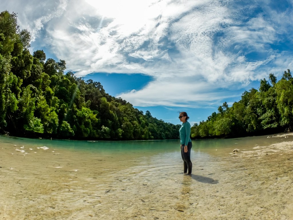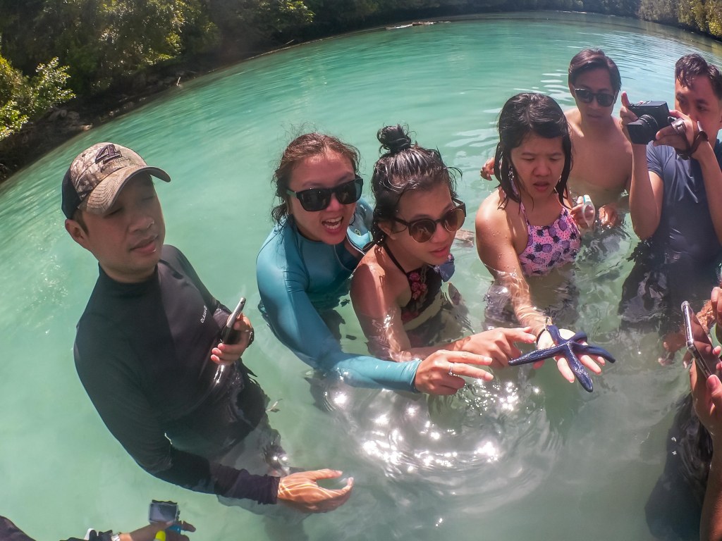 Setelah puas snorkeling, perjalanan kami berlanjut ke daratan di sebuah pulau kecil yang tersembunyi. “Di sini ada gua dengan bintang laut sebesar piring dan kolam biru ajaib!” kata guide kami, sambil menunjuk tebing karang yang menjulang.