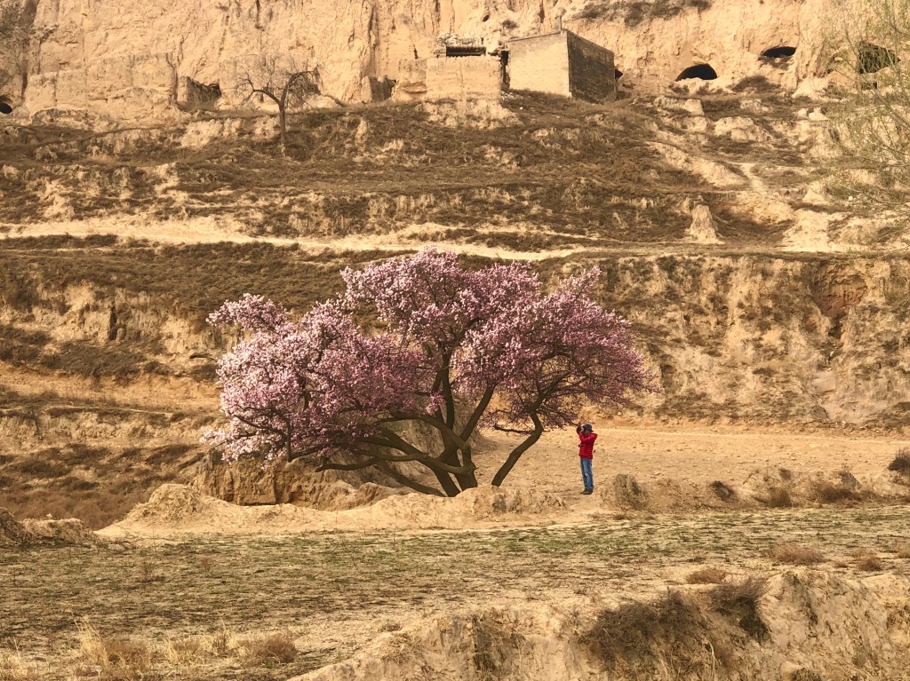 Kami sama sekali nggak menyangka—di tengah landscape Jingbian yang didominasi tebing merah dan gurun kering, ternyata ada sakura bermekaran tepat di belakang homestay kami! “Wah, dapat bonus sakura gratis nih!”