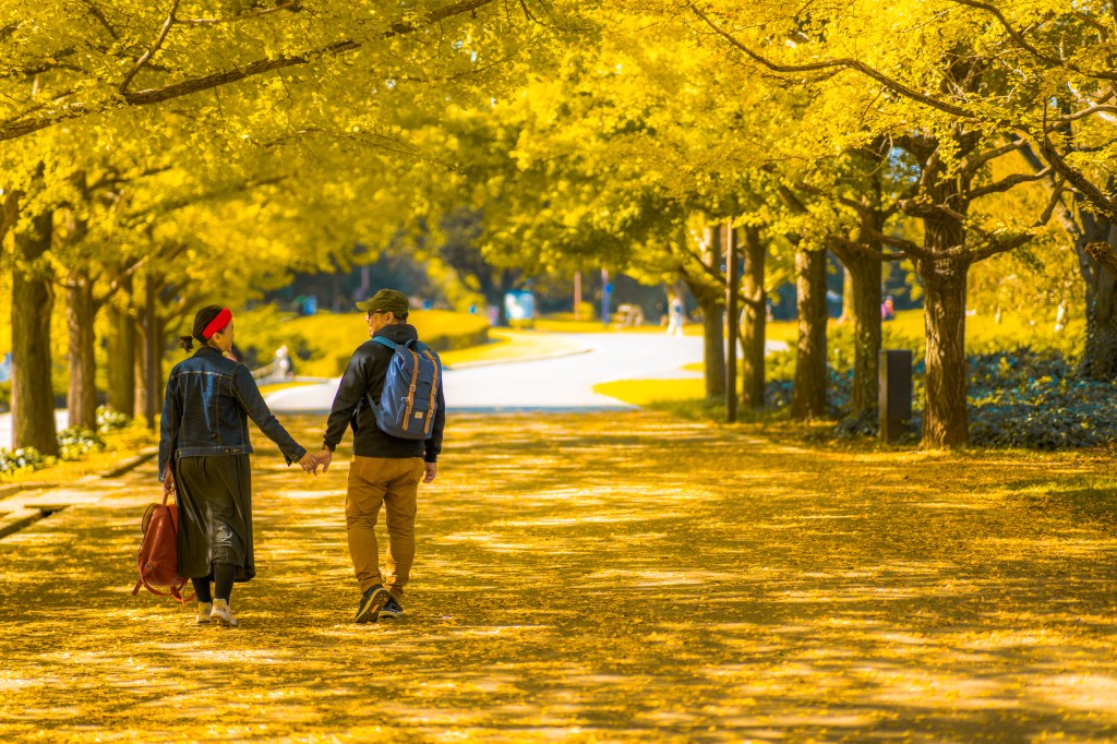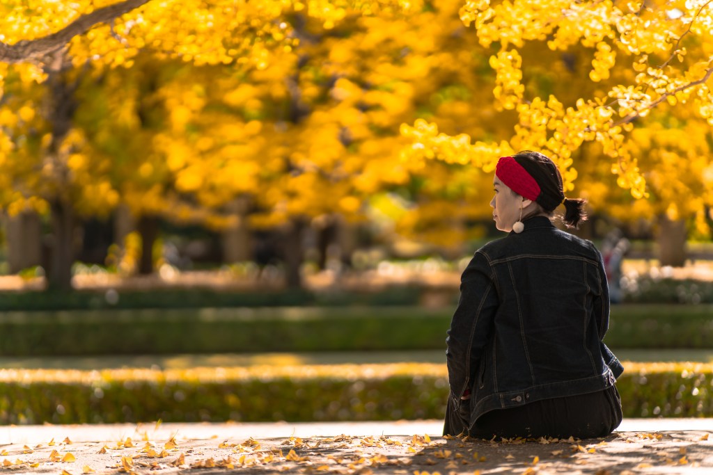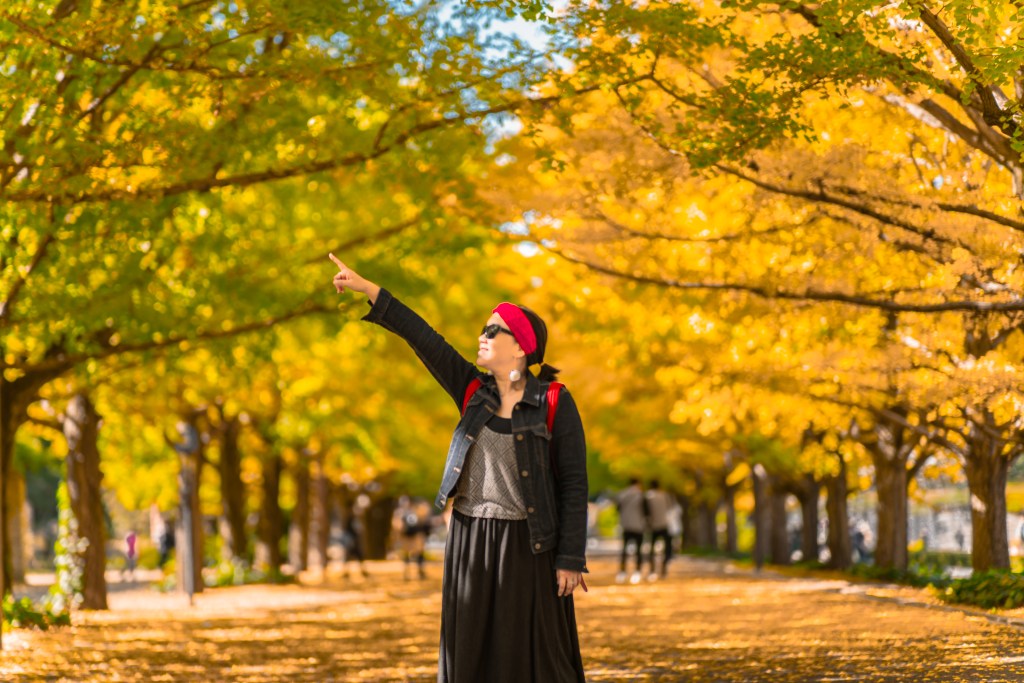 “Berjalan di bawah hujan daun ginkgo yang perlahan jatuh… seperti berada di dunia lain yang hanya ada sekali setahun.”
