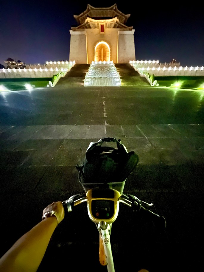 Sehabis makan malam dimana kami masih ada energi akibat kekenyangan, maka kami putuskan untuk menyewa Youbike lagi dan kali ini menyusuri jalanan pusat kota menuju Chiang Kai-Shek Memorial Hall yang megah. Perjalanan melalui jalan-jalan kota yang terang benderang merupakan pemandangan yang patut disaksikan.