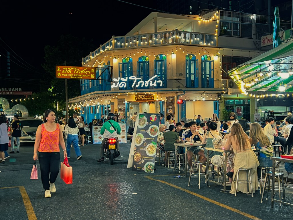 Saat malam tiba, kami menuju ke salah satu restoran rekomendasi MICHELIN Guide Thailand yang terkenal dengan Mama noodle tom yumnya. Perjalanan menuju daerah ini memberi kami sekilas jalan-jalan Bangkok yang ramai, dipenuhi banyaknya antrian di beberapa rumah makan sebagai pusat kuliner malam yang sedang viral. Tempat ini ramai dengan wisatawan asing dan lokal, yang namanya tidak asing sekarang ini, Banthat Thong! Kalau dengar nama tempat ini sudah pasti kangsung ingat dengan retoran Jeh O Chula, Neung Nom Neua, Jae Wan, dan beberapa outlet hits lainnya yang antriannya super panjang!