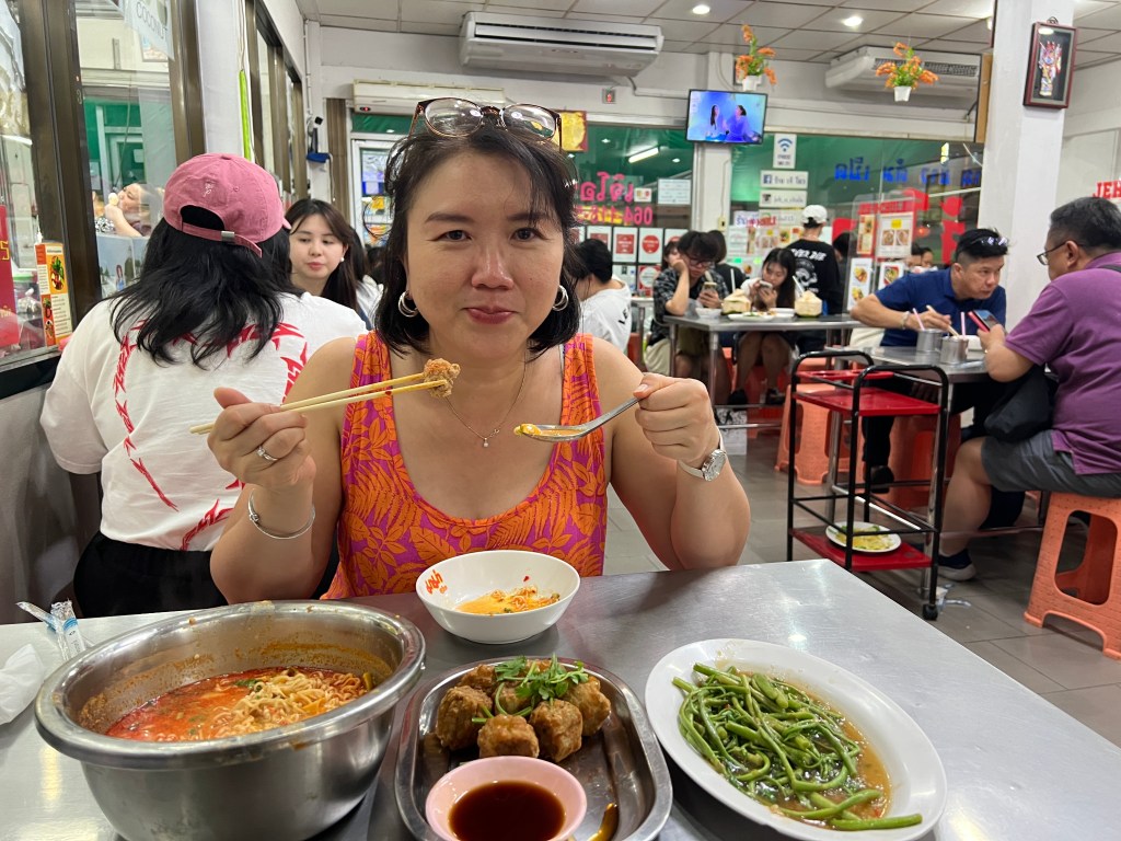 Pilihan kuliner kami di malam ini adalah Mama Noodle Tom Yum, Jeh O Chula , waktu menunjukan jam 10 malam, namun karena tempat ini sangat populer sehingga kami harus menunggu sekitar dua jam untuk mendapatkan meja melalui sistem aplikasi antrian. Kami memesan semangkuk mie tom yum. Kuahnya kaya dengan bumbu, diisi dengan mie instant Mama noodle yang lembut, baso daging cincang yang lezat, dan rempah pedas yang segar, yang cukup pedas di lidah kami.