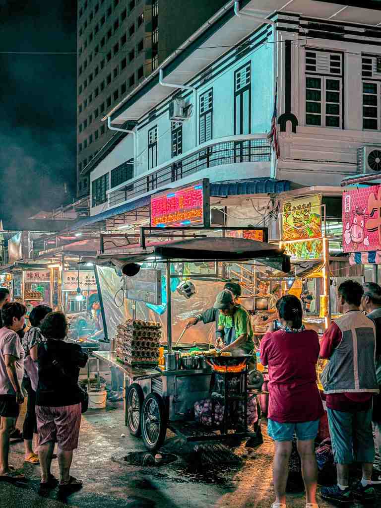 Malam hari, kami menjelajahi night street food market di sekitar hotel. Antrian panjang di Chong Charcoal Seafood Char Koay Teow langsung menarik perhatian —Char Koay Teow-nya di masak pakai arang; smoky, gurih, dan penuh udang besar!