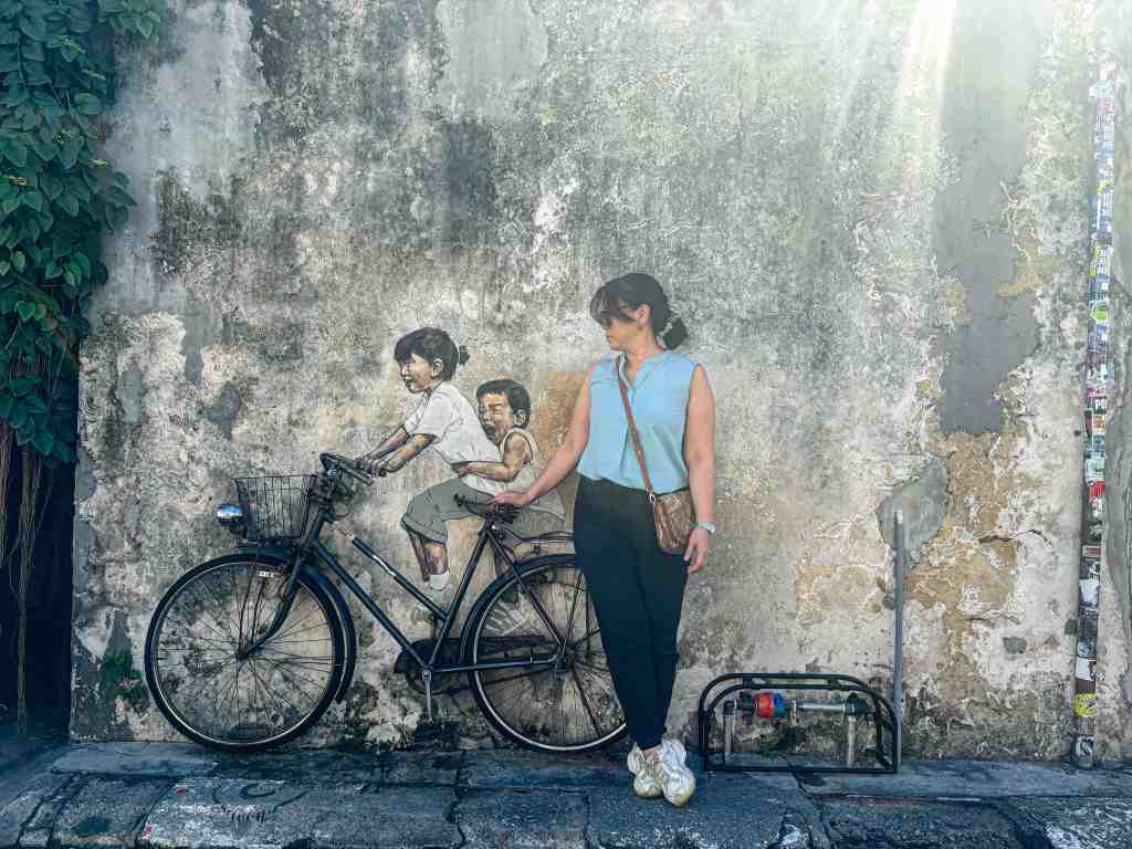 Pagi hari dimulai dengan santai. Kami keluar dari Hotel Citadines dan langsung menjelajahi kawasan street art Penang. Setiap sudut temboknya penuh dengan mural-mural unik, dan kami pun tak mau ketinggalan berfoto-foto ala turis.