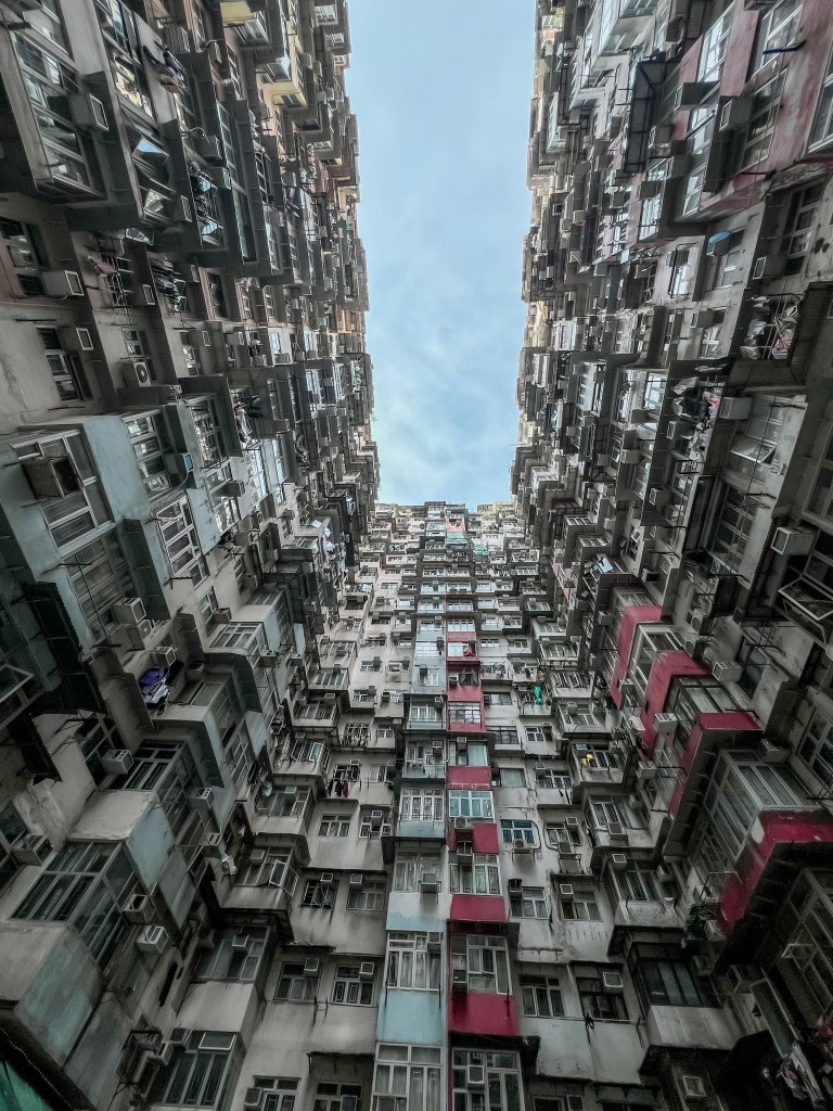 Kami masuk melalui celah sempit antara gedung-gedung. Seketika, suasana berubah: lapangan dalam yang dikelilingi oleh ratusan jendela apartemen menciptakan kesan claustrophobic namun memesona. Pakaian yang dijemur bergantungan di balkon, suara televisi dari dalam unit, dan percakapan dalam bahasa Kanton memenuhi udara.