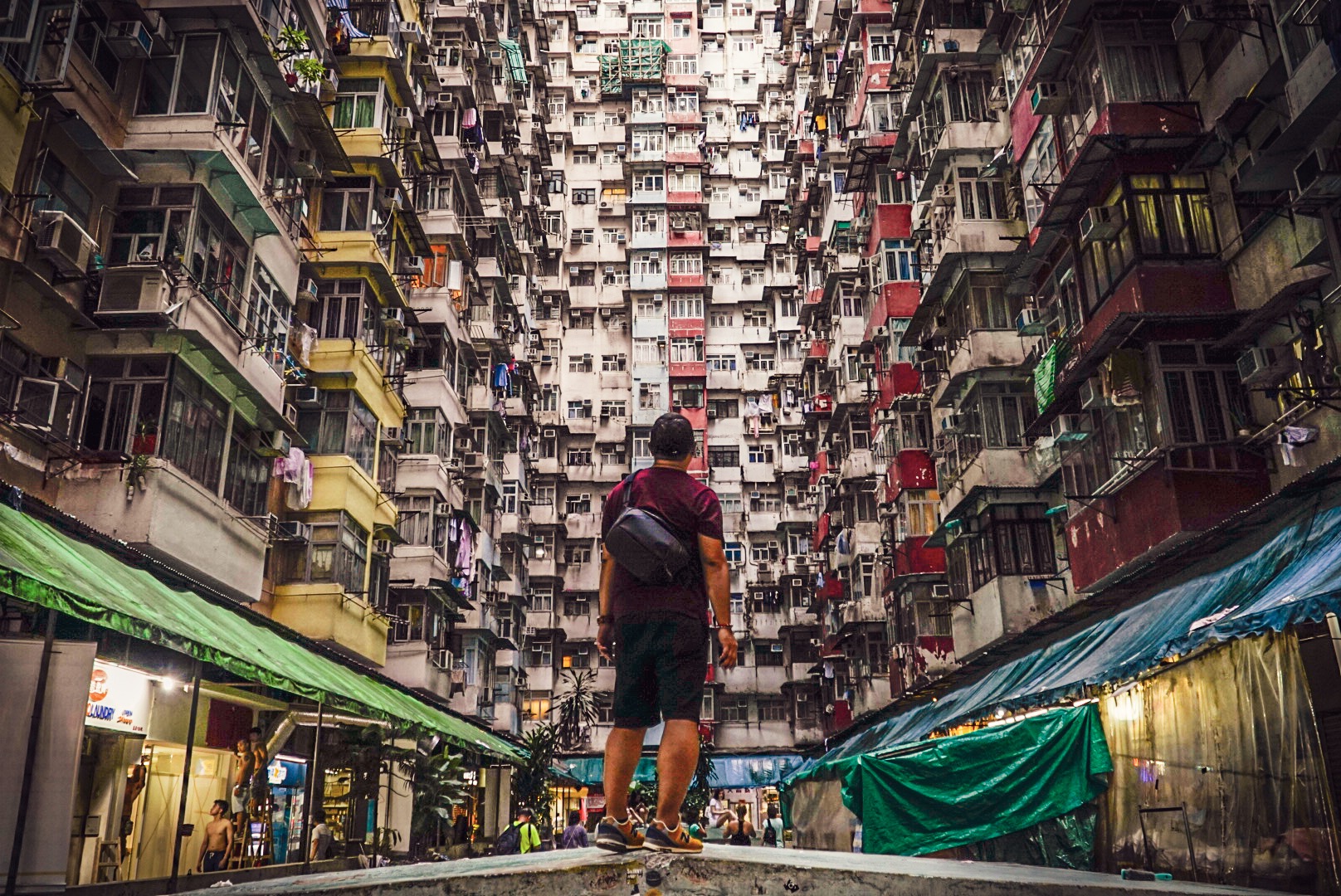 Tujuan kami hari ini: Monster Building, kompleks perumahan lokal Hong Kong di Quarry Bay yang terkenal karena arsitekturnya yang padat dan fotogenik.