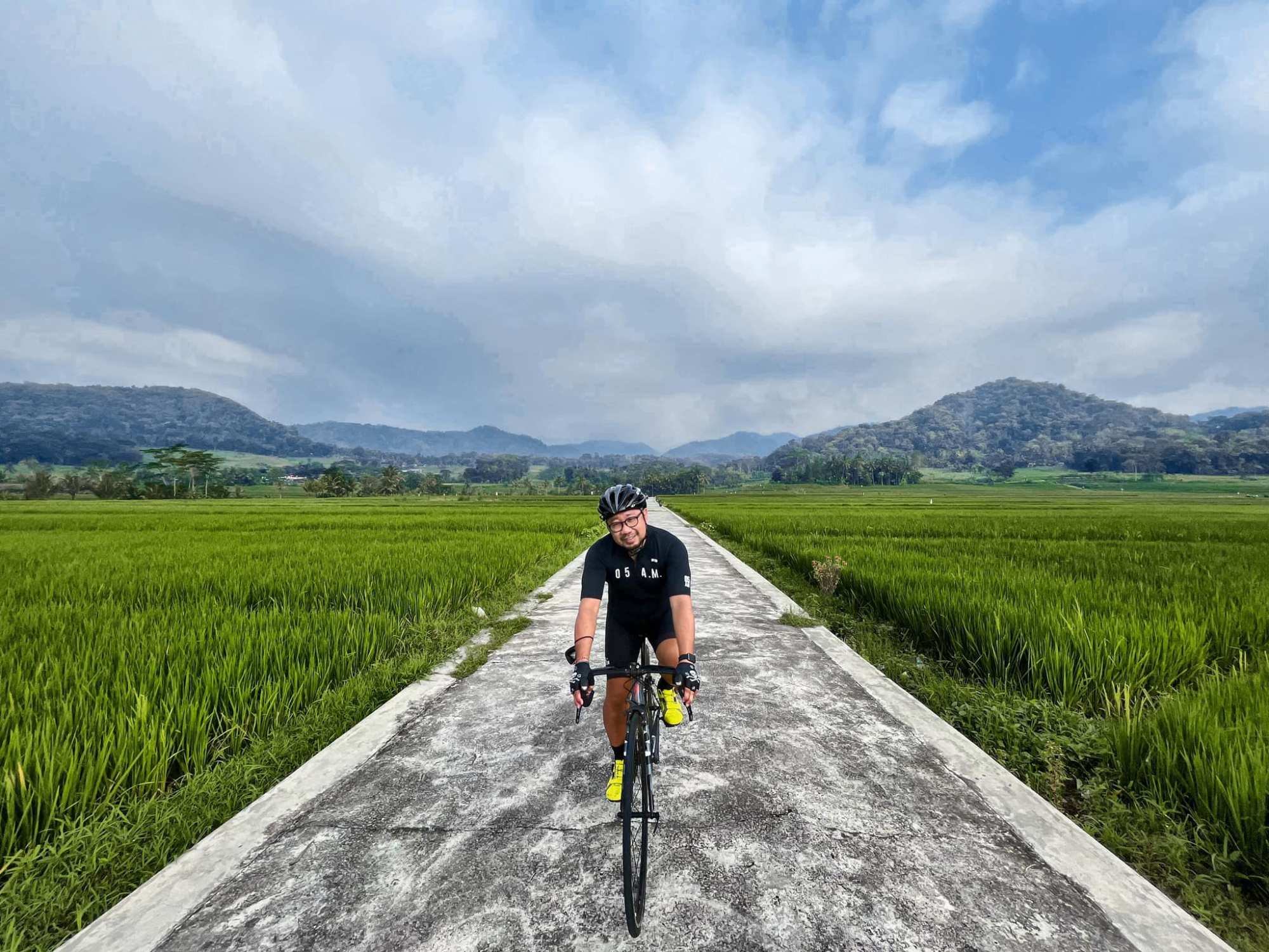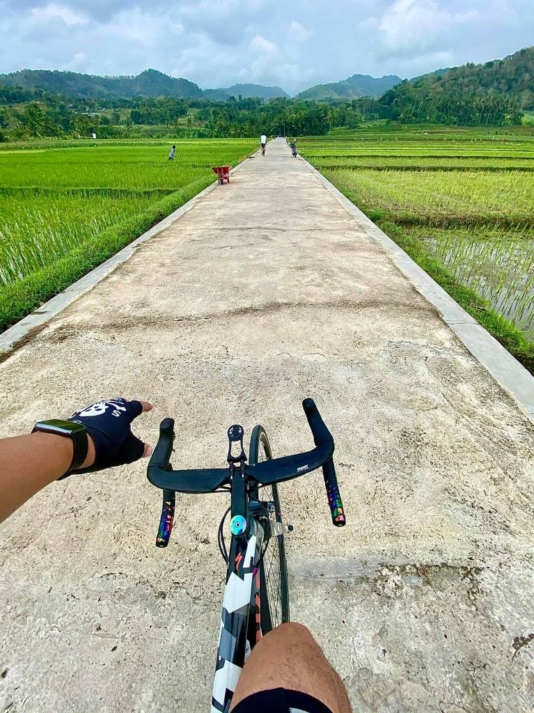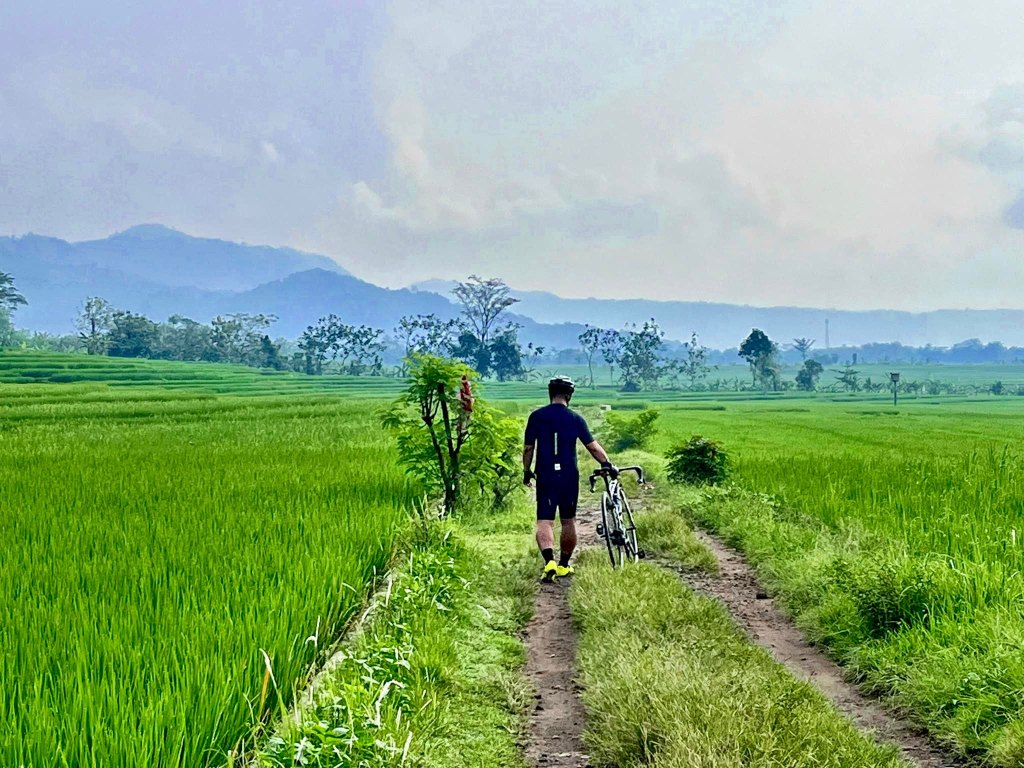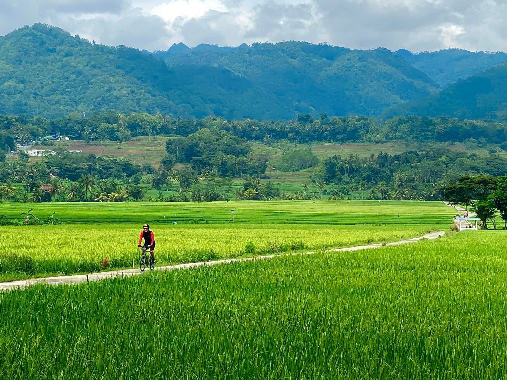 Sepanjang jalan, pemandangan sawah menghampar hijau menyambut. Jalurnya mulus, landai, dan dikelilingi oleh pepohonan rindang, membuat perjalanan terasa begitu nyaman. Suara burung-burung dan gemericik air irigasi kecil seolah jadi musik alam yang menemani setiap kayuhan. Beberapa petani terlihat sibuk bekerja, sesekali melambaikan tangan ramah.