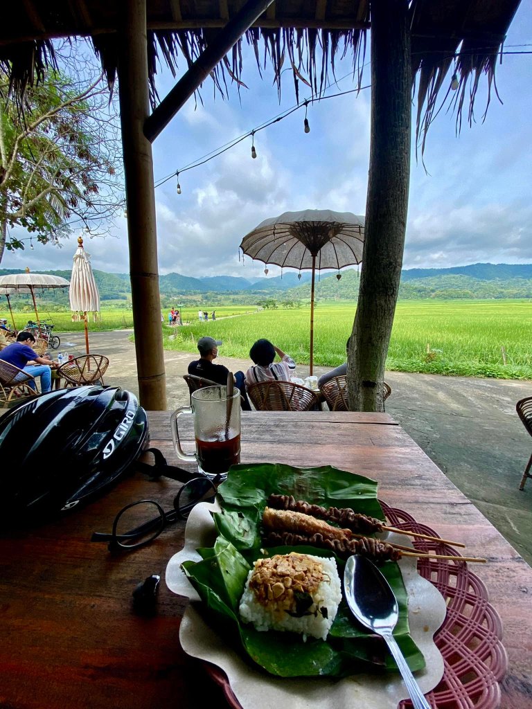 Setelah puas mengayuh, aku mengakhiri perjalanan di Warung Geblek Pari & Geblek Menoreh View. Warung ini terkenal karena menyajikan geblek, makanan khas Kulon Progo berupa olahan tepung singkong yang digoreng. Aku memesan geblek hangat plus secangkir kopi lokal yang aromanya menggugah selera dan makanan angkringannya.