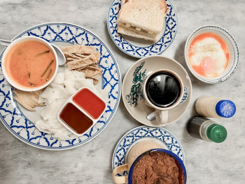 - Morning Roti Bakar Set: Sepotong roti panggang yang sempurna—renyah di luar, lembut di dalam—diolesi mentega dan kaya (selai santan dan telur) yang wangi. Set ini dilengkapi dengan dua butir Half Boiled Egg yang masih hangat dalam mangkuk kecil. Kami menambahkan kecap asin dan lada putih, lalu mengaduknya menjadi sutra krem yang nikmat sebelum dituang ke atas roti.