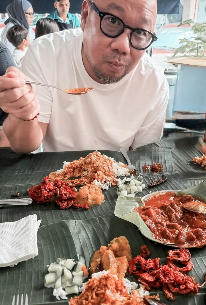 Pengalaman makan di sini benar-benar otentik. Kami memesan Nasi Kandar dan disajikan di atas daun pisang. Sensasi makan dengan alas daun pisang ini langsung menambah dimensi rasa yang lebih tradisional dan aromatik. Kami menyantap nasi putih pulen yang dilumuri berbagai kuah kari—dari kari daging, ayam, hingga ikan—dengan lauk-pauk seperti fried chicken, lamb, dan sotong. Rasanya begitu kaya rempah dan menggugah selera, sebuah kuliner yang benar-benar mewakili cita rasa Malaysia.