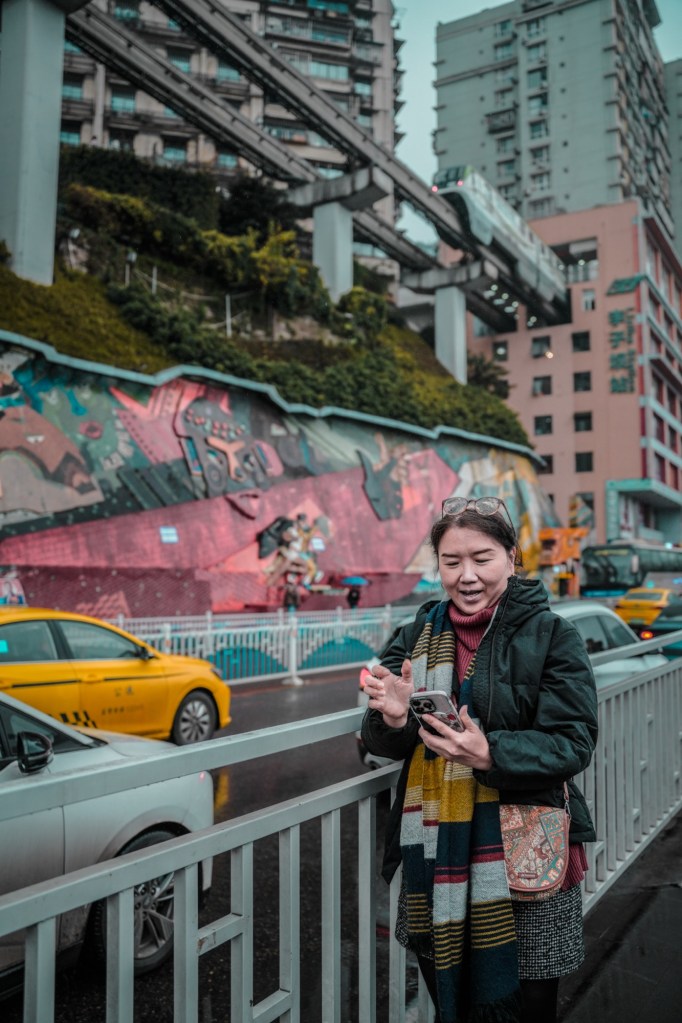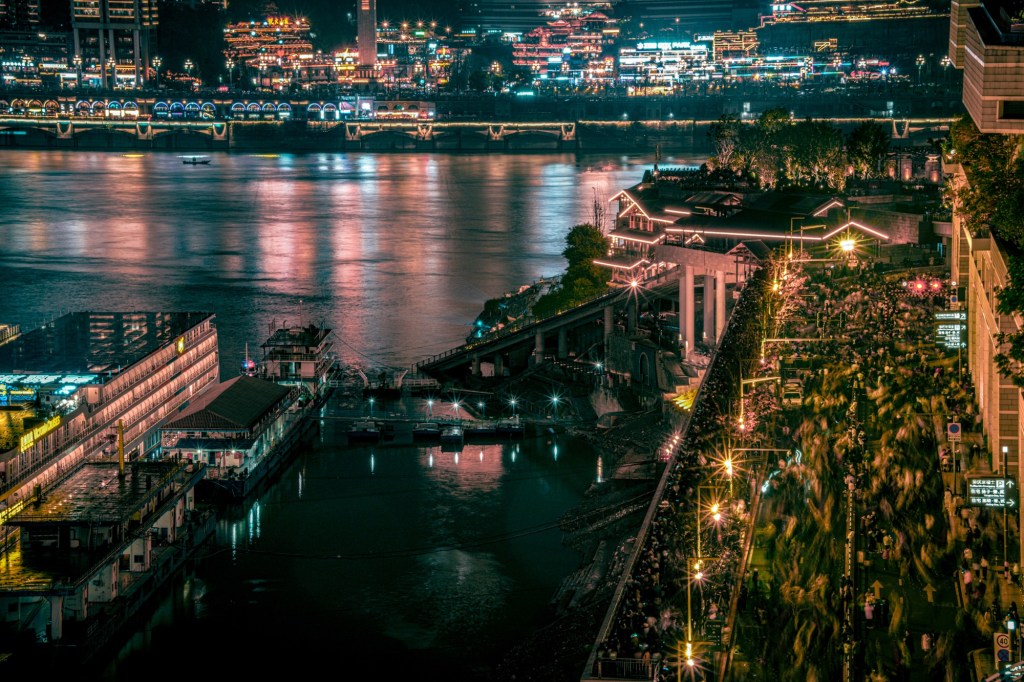 Setelah kenyang, kami melanjutkan petualangan ke atraksi yang hanya ada di Chongqing: “makan kereta”. Kami menuju ke seberang sungai, tepatnya di area dengan view Stasiun Liziba di seberangnya.