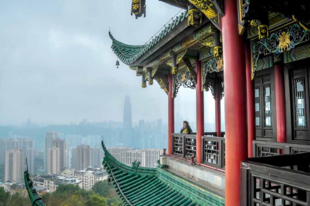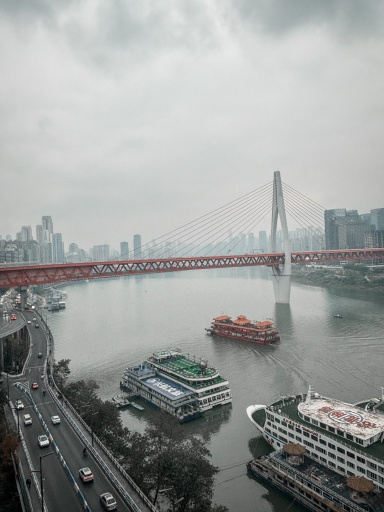 Dari titik ini, terbentang pemandangan luas kota Chongqing dengan gedung-gedung pencakar langitnya dan Sungai Yangtze di kejauhan. Ini adalah perspektif yang berbeda dan lebih tenang dibandingkan keramaian di Hongyadong.