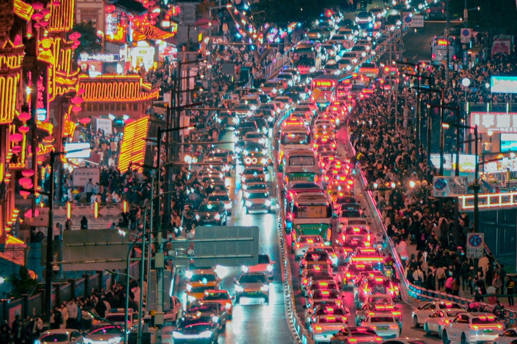 Siluet gedung Hongyadong yang bertingkat-tingkat seperti istana dalam dongeng. Namun, keramaian di sekelilingnya hampir tak tertahankan; jalanan dipadatkan oleh lautan pengunjung yang ingin merasakan suasana tahun baru.