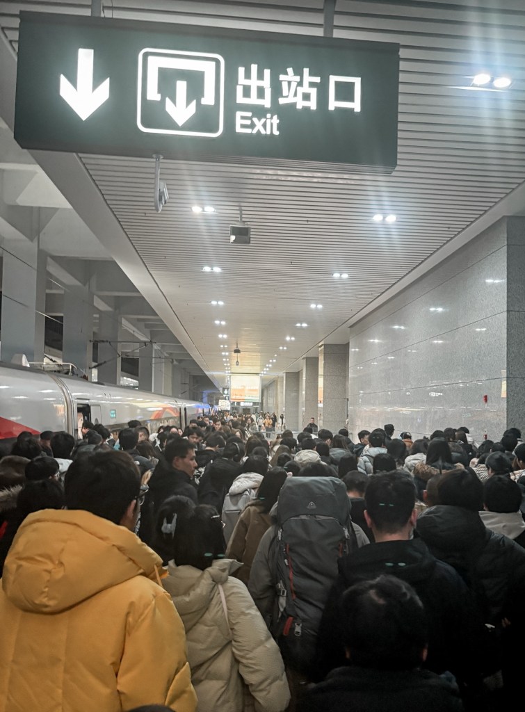 Sesampainya di Stasiun kereta Shapingba, kami langsung disambut oleh sebuah fenomena yang lain dari biasa: hujan dan lautan manusia.