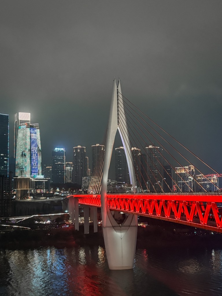 Dengan perut kenyang, kami berjalan kaki menuju Hongyadong (洪崖洞). Alih-alih langsung masuk dari bawah yang ramai, kami justru tiba di area atasnya terlebih dahulu. Dari sini, kami disuguhi pemandangan spektakuler jembatan lengkung besar yang diterangi lampu merah terang membentang di atas Sungai Jialing. Kami berfoto dengan latar belakang ikon ini, menikmati angin malam dan kerlip lampu kapal.
