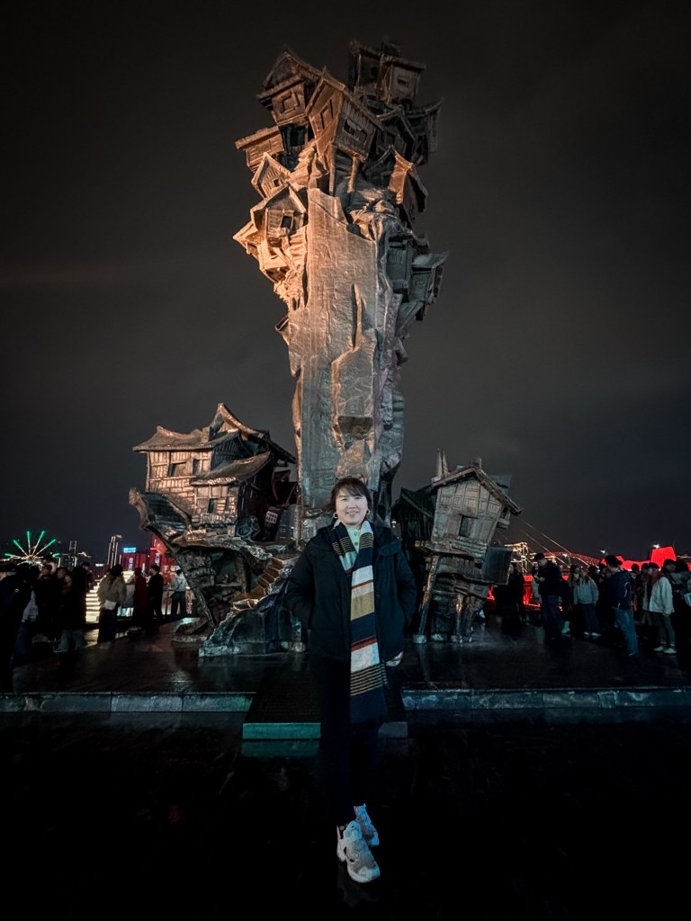 Sebelum memulai penjelajahan vertikal, kami berhenti di salah satu ikon fotogenik di pelataran atas: sebuah patung atau instalasi artistik berbentuk miniatur rumah-rumah tradisional yang bertumpuk dan bersusun, persis mencerminkan karakter arsitektur Hongyadong dan seluruh kota Chongqing yang bertingkat-tingkat di atas tebing. Berfoto di samping patung ini terasa seperti mengabadikan esensi kota dalam satu bingkai.