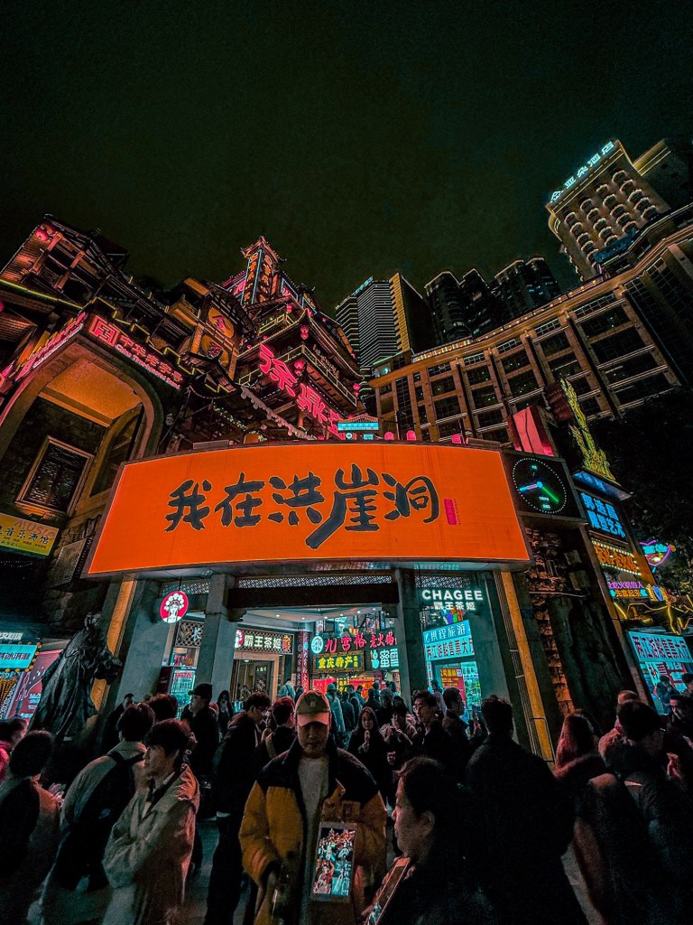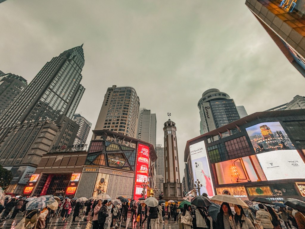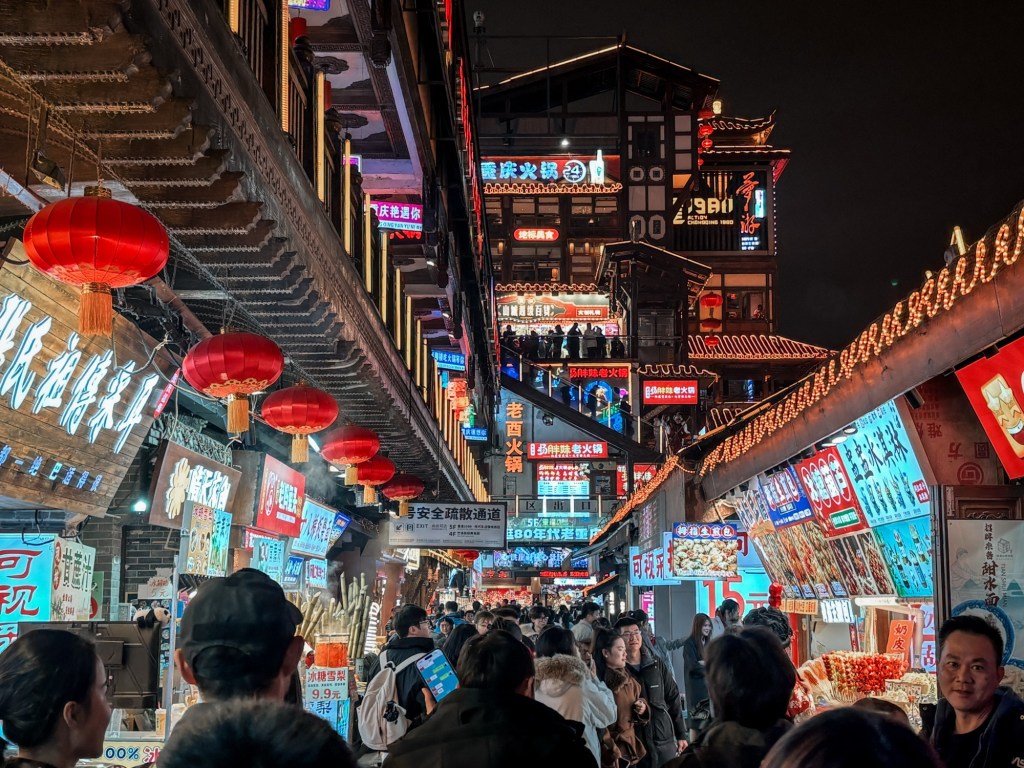 Dengan energi yang masih tersisa, kami memulai eksplorasi perdana. Kami berjalan kaki singkat ke Jiefangbei, kawasan komersial legendaris dengan deretan gedung pencakar langit dan pusat perbelanjaan yang bersinar.