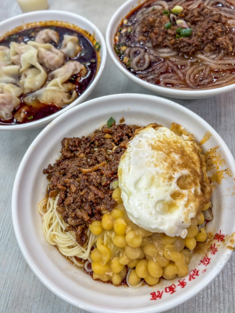 Kedai ini dipadati oleh warga lokal dan turis yang antre untuk sarapan pagi. Kami memesan pangsit (jiaozi) yang disajikan dengan saus pedas khas Sichuan dan semangkuk Mi Xian Mian.