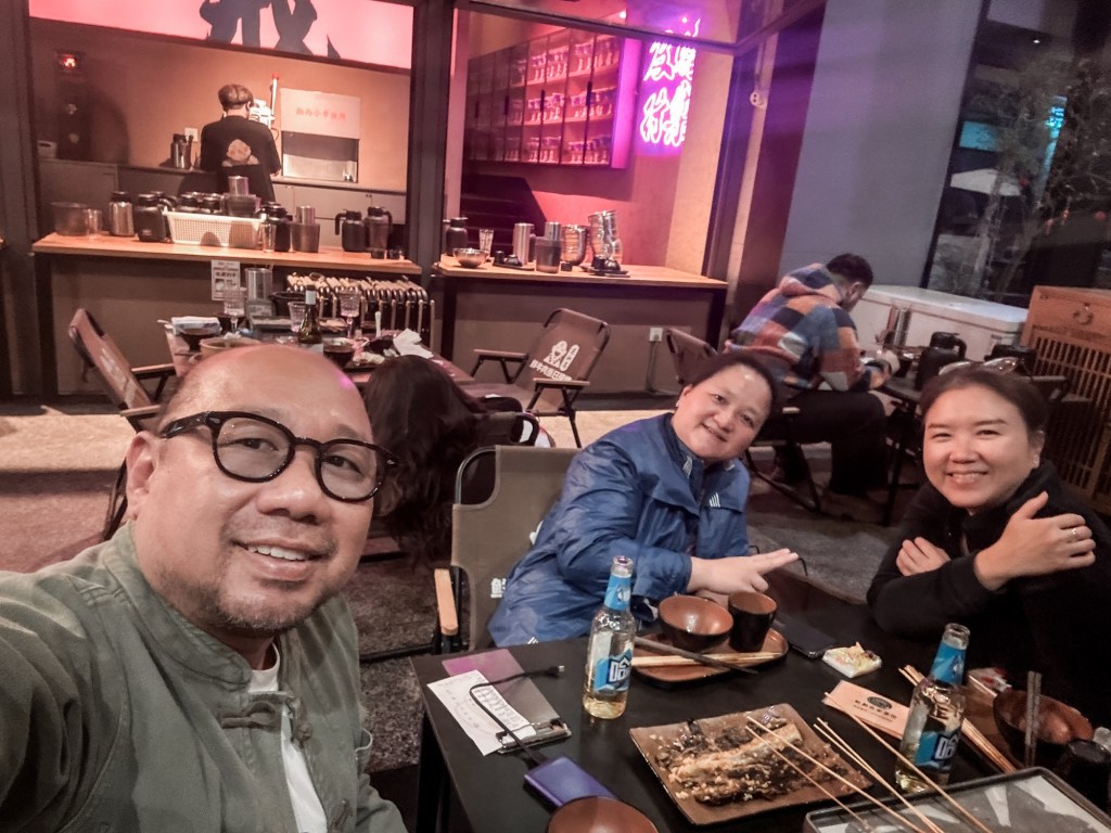Suasana di sini hidup banget, beda sama tempat makan malam tadi. Kami pesan aneka tusuk sate: macam-macam daging, tahu, jamur, dan sayuran. Setelah dipanggang dengan bumbu rempah yang wangi, sate-sate itu datang dalam keadaan panas dan menggiurkan. Makan sate ditemani sebotol bir lokal, sambil ramai-ramai di tengah keriuhan malam Guangzhou benar-benar pengalaman seru buat nutup hari!