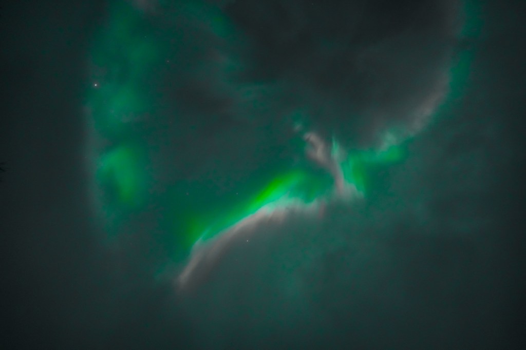 Aurora muncul! Meskipun hanya sedikit dan tipis, tidak sekuat malam sebelumnya, tapi setidaknya kami tidak pulang dengan tangan kosong.