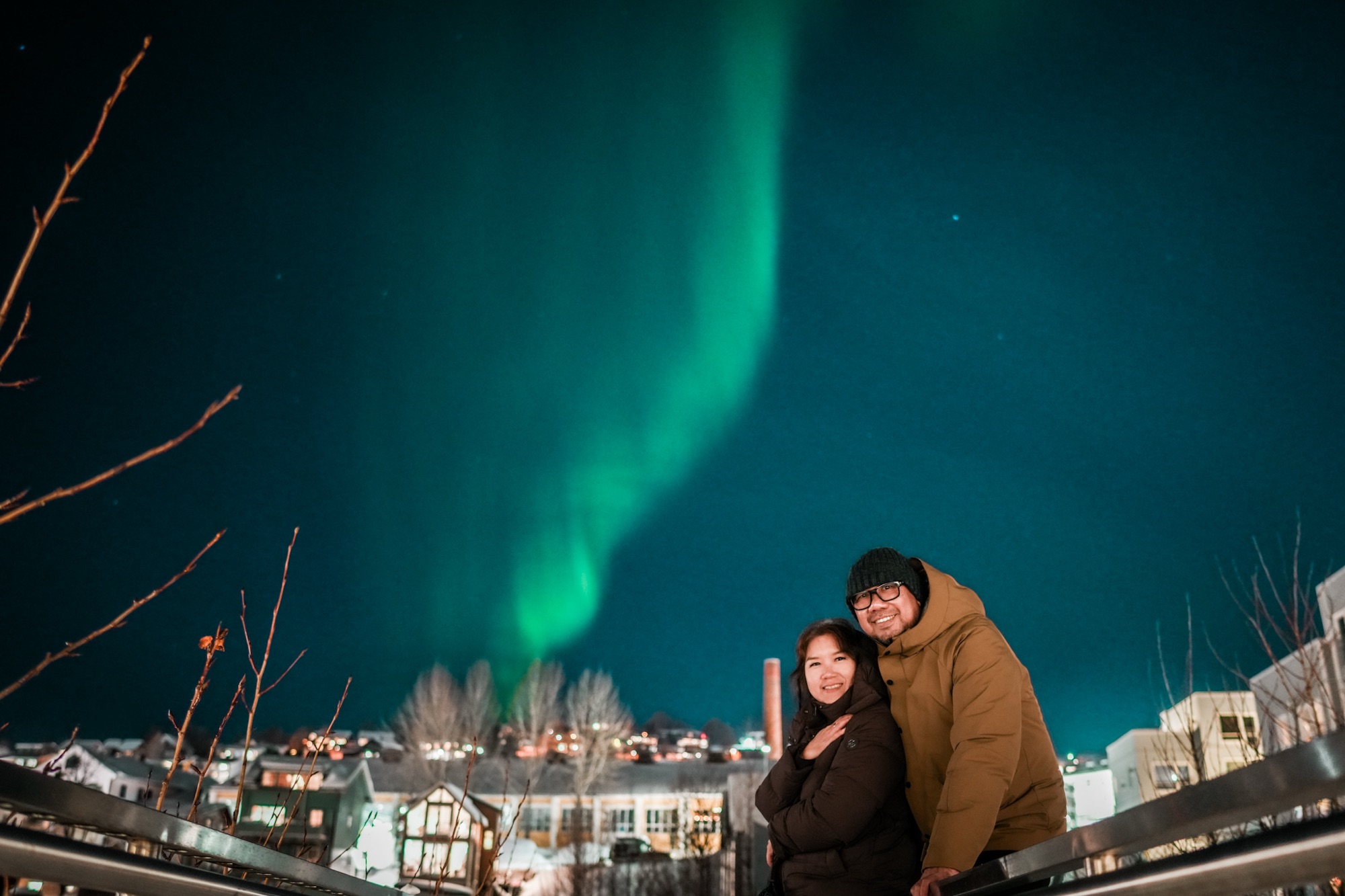 Kami berdiri di tepi harbour, dengan kapal-kapal bersandar di depan kami, lampu kota berkelap-kelip, dan aurora menari di atas semua itu.