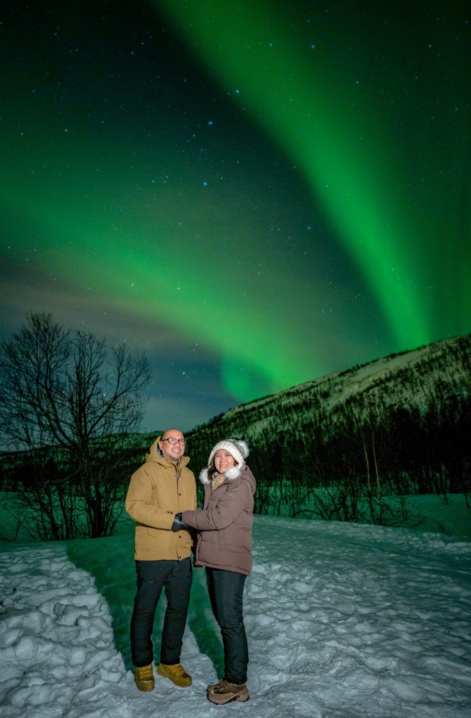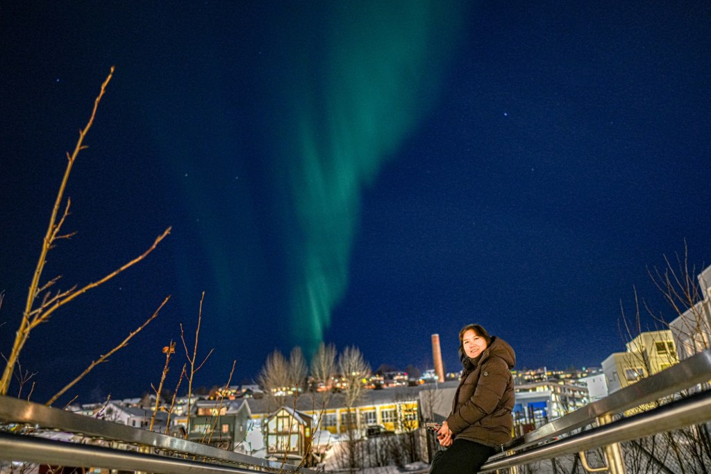 Setelah perjalanan panjang 19 jam dari Hongkong dan transit di dua kota, kami tiba di Tromsø dan disambut salju. Malam harinya, kami bergabung dengan aurora tour pertama. Sebagai pemula, kami tidak tahu apa yang harus diharapkan. Guide mengatakan KP index aurora forecast saat itu ada di bawah 2 dan membawa kami ke luar kota, menjauhi polusi cahaya. Langit gelap, bintang-bintang mulai terlihat. Dan tiba-tiba…guide kami menyebutkan kalau di langit ada AURORA!